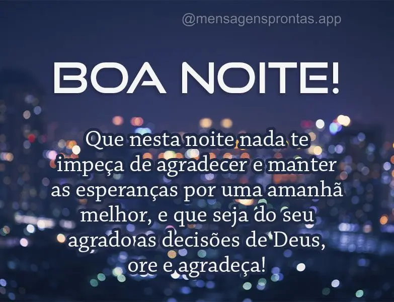 Que nesta noite nada te impeça de agradecer e manter as esperanças por uma amanhã melhor, e que seja do seu agrado as decisões de Deus, ore e agradeça! Boa noite!