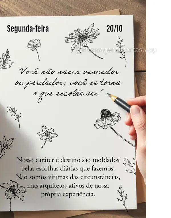 "Você não nasce vencedor ou perdedor; você se torna o que escolhe ser." Nosso caráter e destino são moldados pelas escolhas diárias que fazemos. Não somos vítimas das circunstâncias, mas arquitetos ativos de nossa própria experiência. 20/10 Segunda-feira